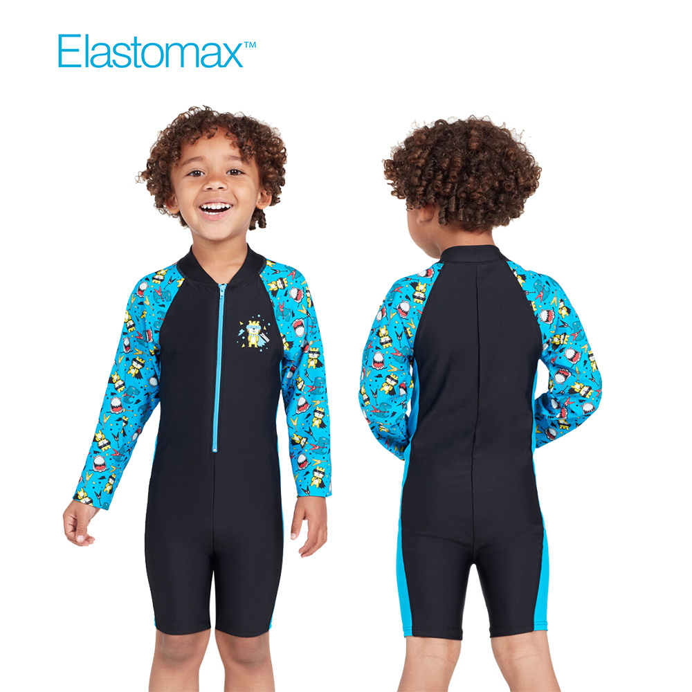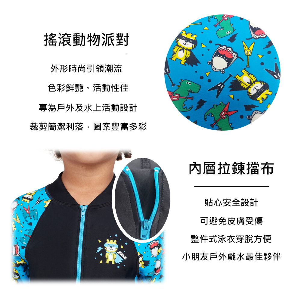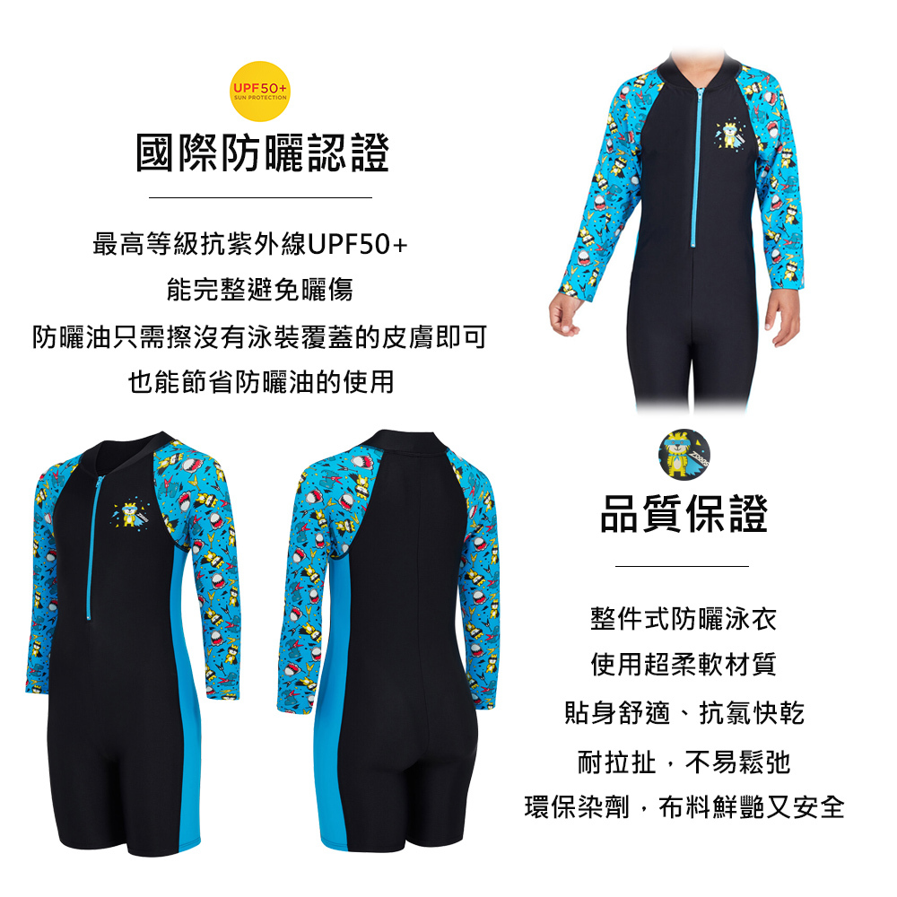 - 整件式泳衣穿脫方便且能完整避免曬傷