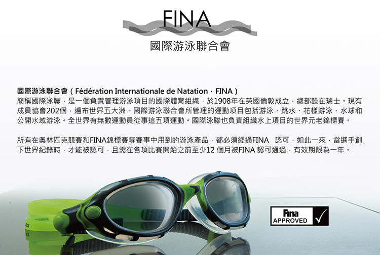 - 國際泳聯認可 : 此款泳鏡為批准使用在國際泳聯認可的賽事
