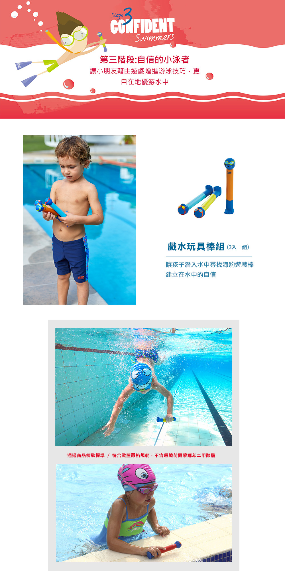 - 讓幼童潛入水中尋找海豹遊戲環,建立在水中的自信